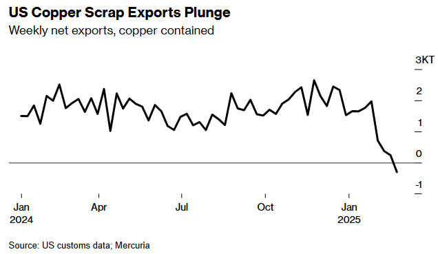 此外,關(guān)稅威脅已導(dǎo)致美國(guó)廢銅出口枯竭,這一點(diǎn)也至關(guān)重要——全球銅產(chǎn)量的約三分之一來(lái)自廢銅,廢銅的流動(dòng)往往起到市場(chǎng)緩沖的作用,在價(jià)格高時(shí)上升,在價(jià)格低時(shí)下降。
