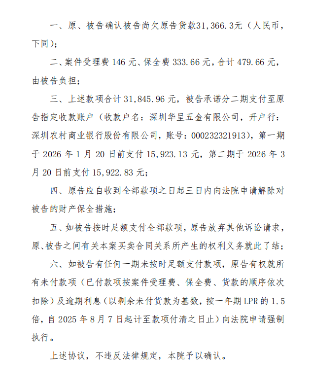 截至2026年2月4日,我司仍未收到調(diào)解約定的成大公司應(yīng)付貨款第一部分,并且無法正常聯(lián)系溝通,目前我司已委托律師向法院申請強制執(zhí)行。